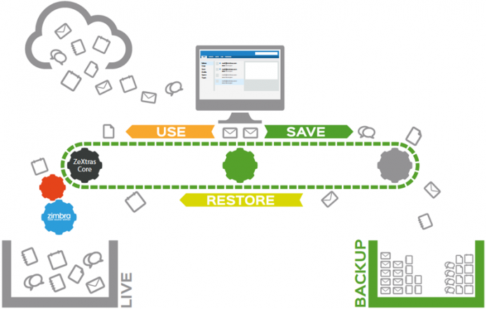 El nuevo motor de respaldo y restauración en tiempo real de Zimbra respalda cada artículo y evento en su servidor con precisión en una fracción de segundo. Está diseñado para evitar la pérdida de datos usando algoritmos atómicos y siempre regulares, a la vez que ahorra espacio en disco (hasta un 50 %) gracias a un sistema de eliminación de duplicados y compresión inteligente. Ofrece seis características de restauración, desde una restauración de un solo elemento hasta una recuperación completa en caso de un desastre. Todos los modos de restauración son transparentes para el usuario final y son 100 % independientes del sistema operativo, la arquitectura y la versión.